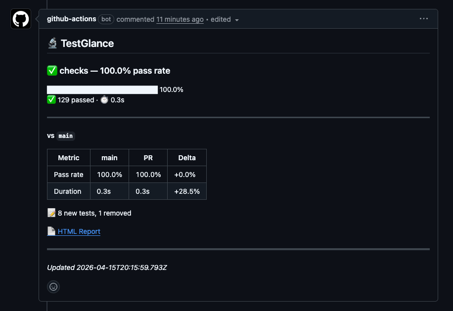 - TestGlance is an open-source GitHub Action that parses your test reports (JUnit XML or CTRF JSON) and renders a readable summary on every run — including PR comments, inline annotations on failing lines, and the slowest tests. It is zero-config and never breaks your CI.